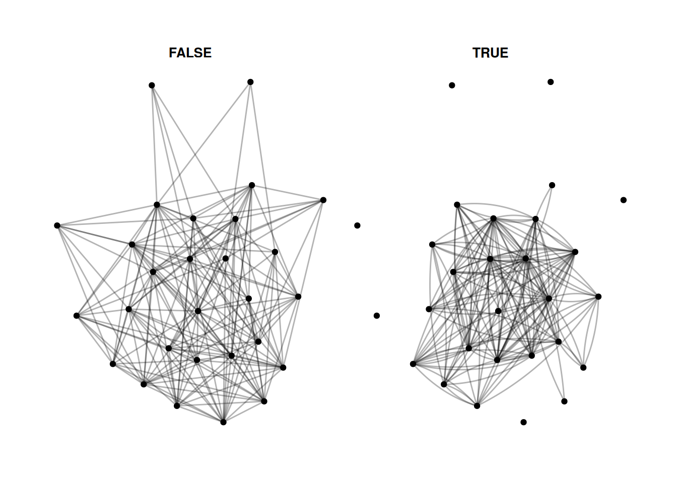 There are a few different options - facet_nodes as used above, splits a network based on node attributes. facet_edges keeps the nodes in the same position, and filters the edges based on some attribute of the edges. For example, this shows reciprocated and non-reciprocated edges.