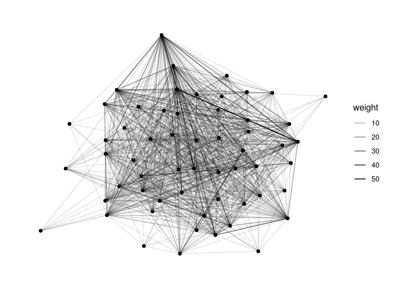 bkfrab dataset (also from networkdata, so load it in the same way as the ffe_friends data above). This records how often pairs of subjects were seen talking to each other in a fraternity. Map the alpha of the edge to the weight in the edges dataframe.Hint: Remember to use as_tbl_graph to change the network type.