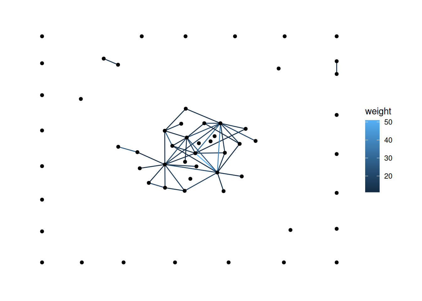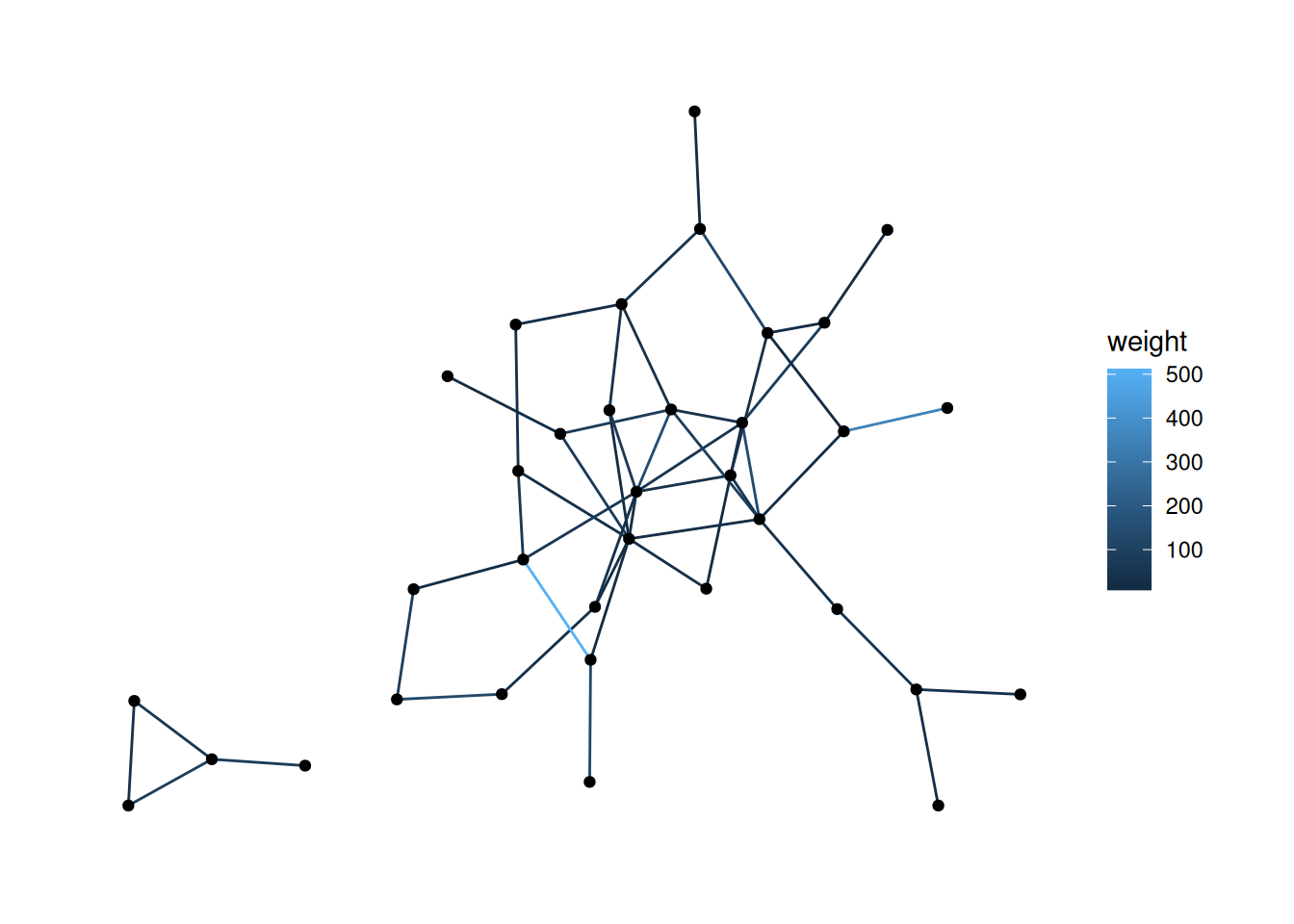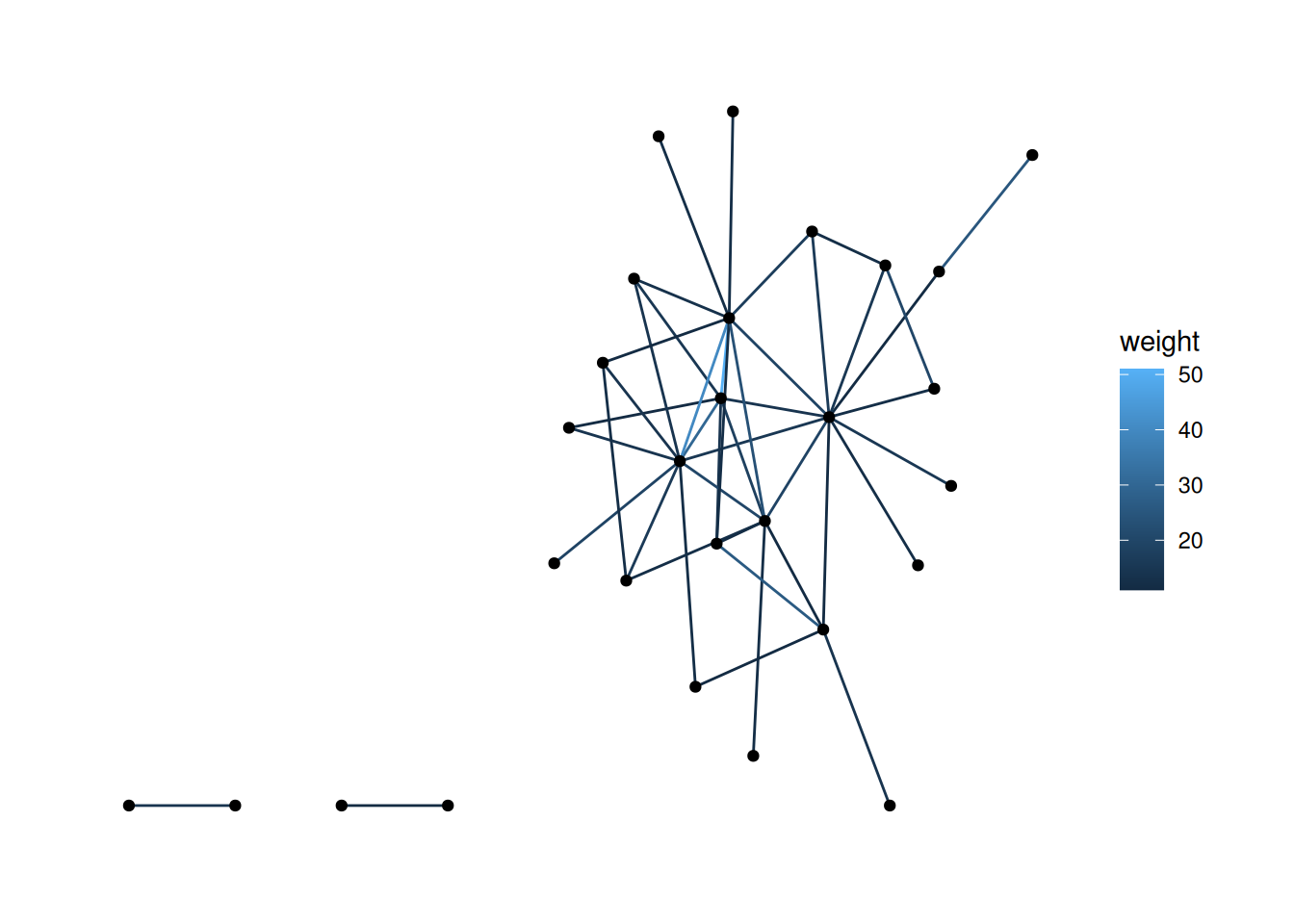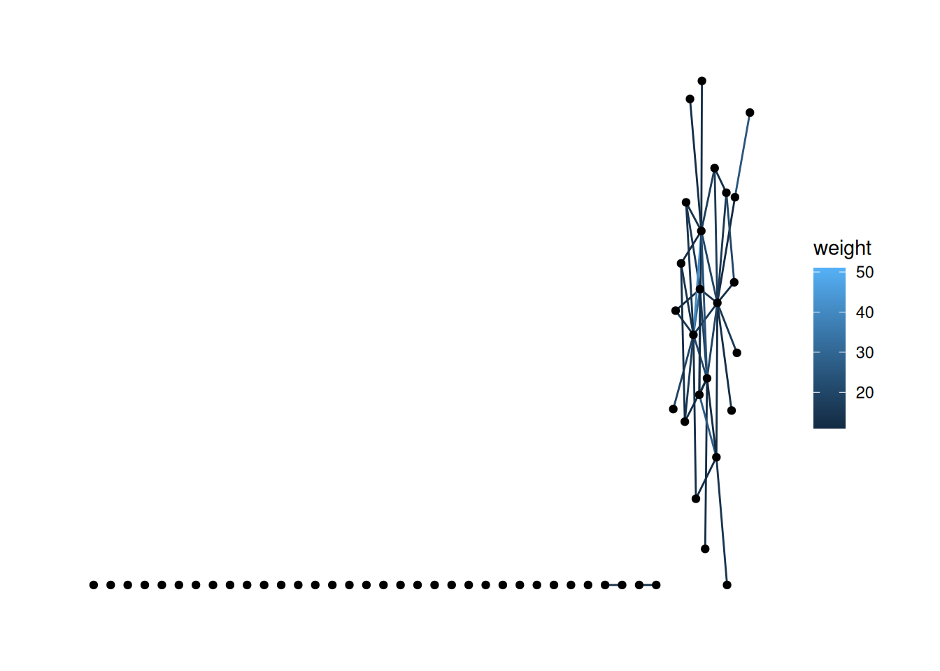 Looking at our data, the edges don’t have weights, so let’s load in a dataset that does. The code below loads the fourth network from the animal_13 data—edges represent how long ants spent near each other—and colors the edges based on their weight.