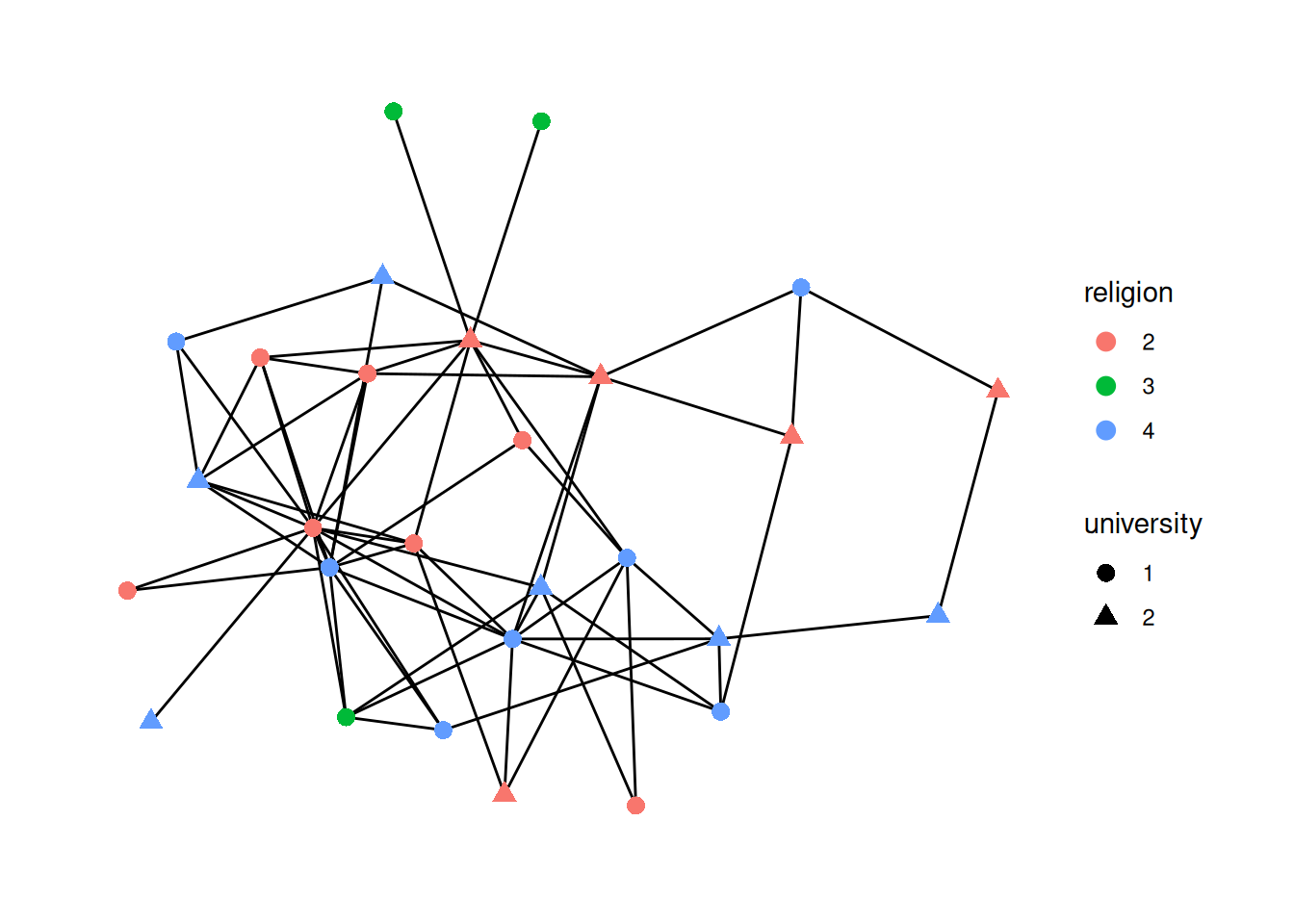 To do that, we “map” the shape of the nodes to the religion variable. The syntax to do this is aesthetic=column name. So, to change the shape based on the data in the religion column, it’s shape = religion. We put that whole thing in aes (which stands for mapping aesthetic), and put it into the geom_node_point function.