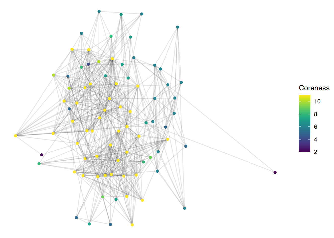 UK |>activate(nodes) |>mutate(coreness =node_coreness()) |>ggraph(layout='stress') +geom_edge_fan(alpha=.1) +geom_node_point(aes(color=coreness)) +scale_color_viridis(name='Coreness')
