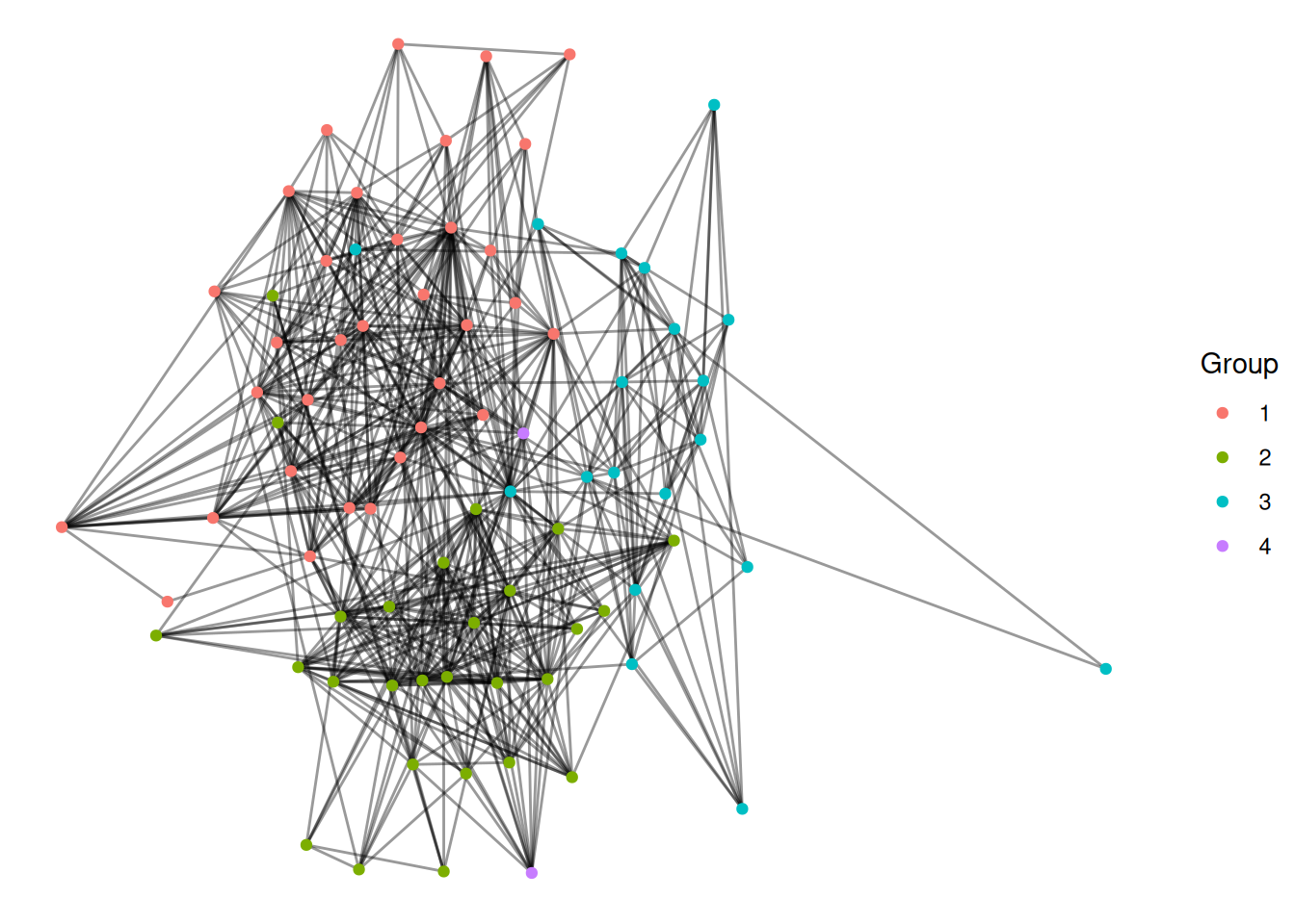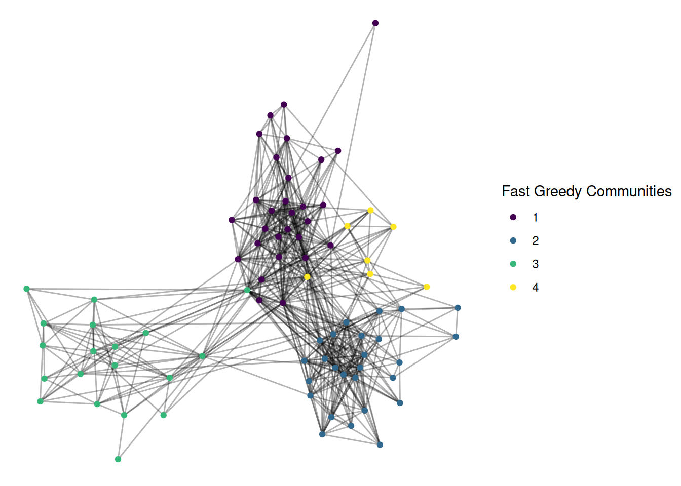 There are a number of more complicated algorithms for finding communities in networks, often called “community detection” or “clustering” algorithms. The very bottom of this page shows those which have been implemented in ggraph.