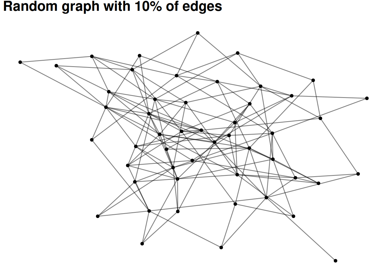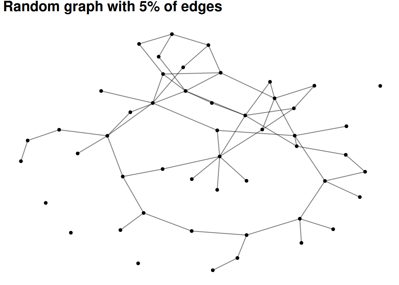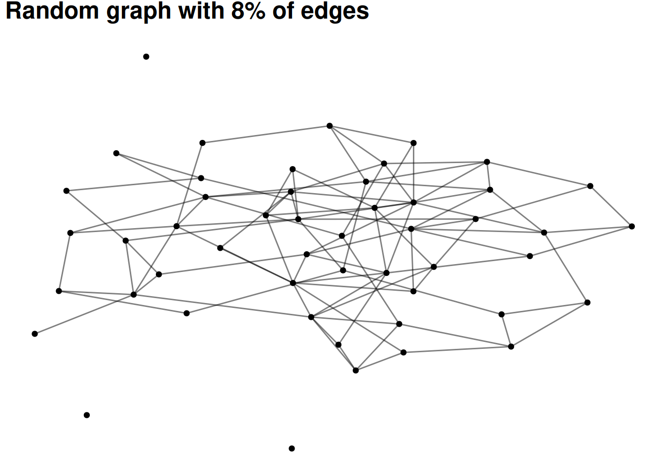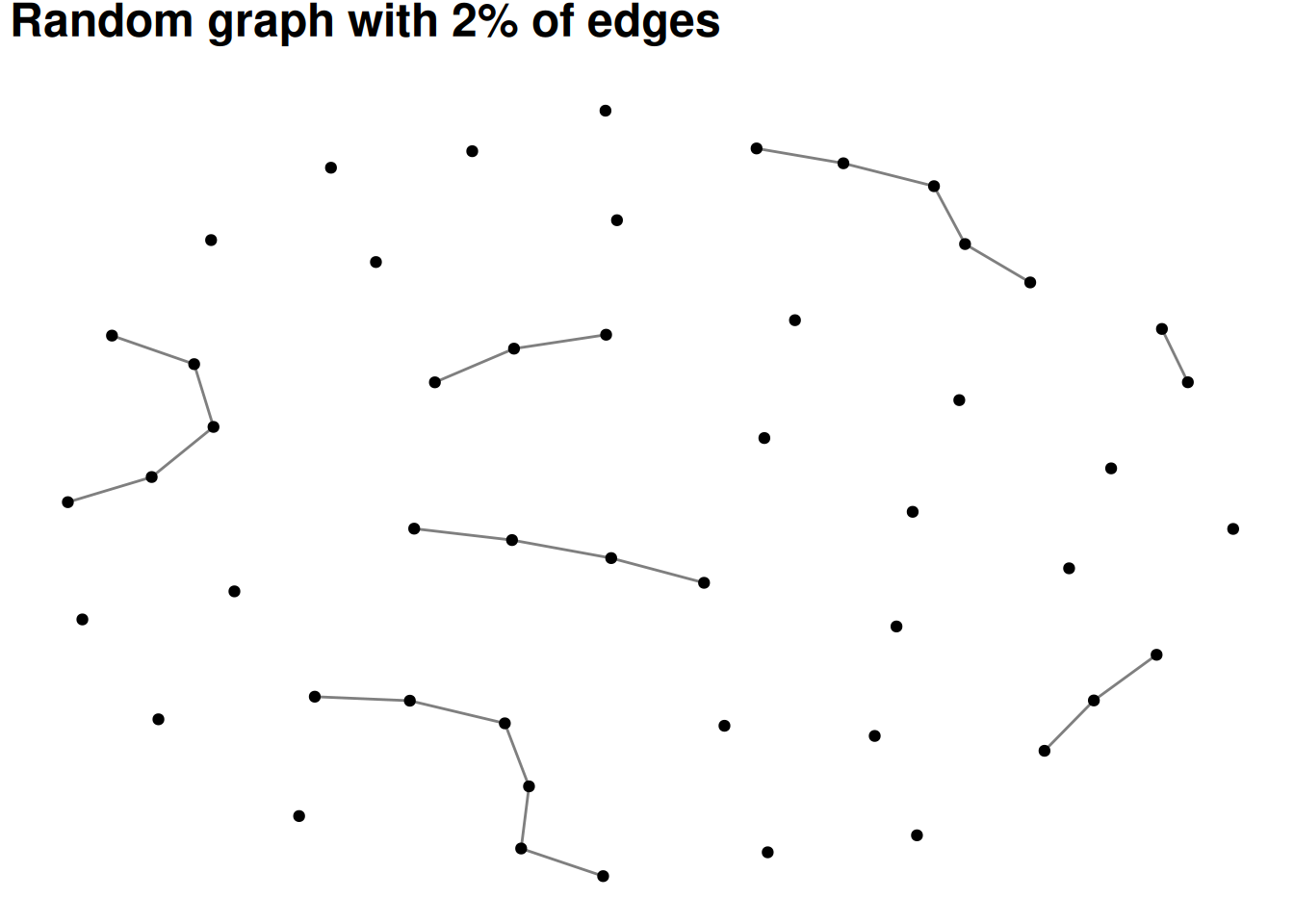 The following visualizations show random graphs as they go from 2% density to 10% density. Even at only 8% or 10% density almost any random graph will be a single, large component (with maybe a few isolates).