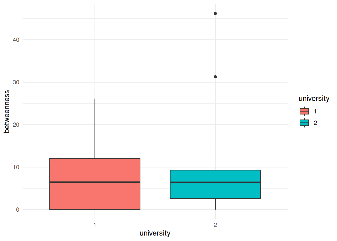 The other thing we might want to do is compare the distributions of some network measure for different groups. There are lots of ways to do this, but the one I’ll show here is a “boxplot”. This shows where the “typical” values are for each group.
