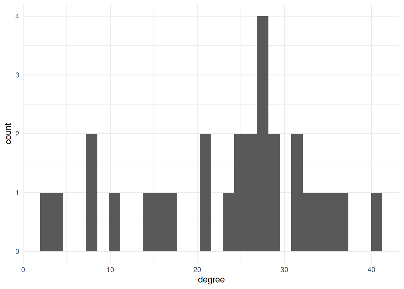 If we want to visualize how centralized a network is, a good way to do that is to show the distribution of degree (or betweenness or another centrality measure.) As we have done in a few previous labs, we’ll first need to create the column using mutate and then we’ll visualize it in the same way, using ggplot and geom_histogram.